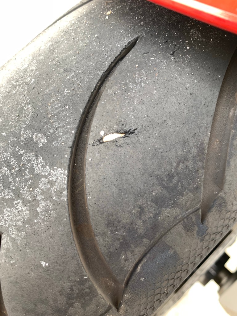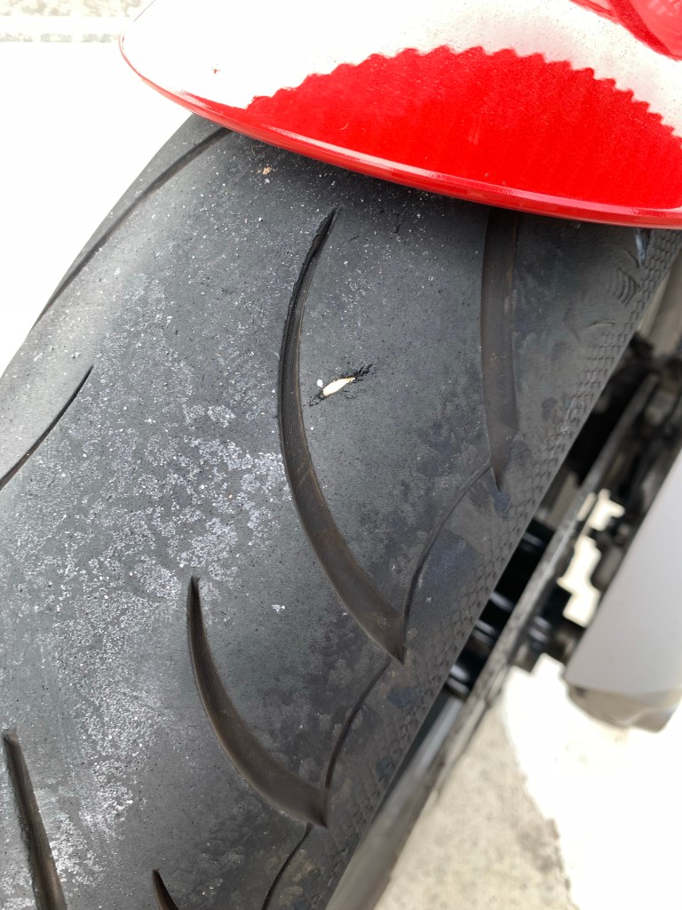 近寄ってみると金属片がしっかり刺さっている。抜くと良く無さそうだと思い、友人にアドバイス求めると、そのままツーリングする案、安全運転でディーラーないしガソリンスタンドの持ち込む案、など出ましたが、気にしながら走るのは気が滅入って楽しめないので独り安全運転で帰る事に。