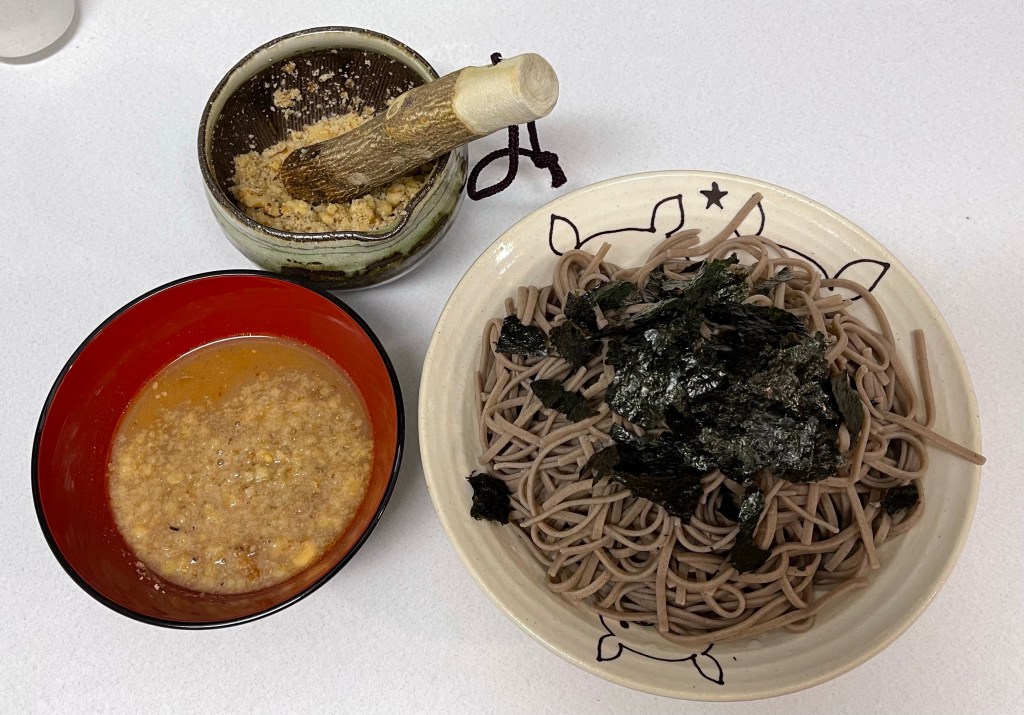 そして帰ってから、深夜ですが楽しみにしてたクルミ十割そば作ってみましたが、超美味しかったです!!クルミ蕎麦用つけ汁に生クルミをすり潰したのを加えたのですが、お店で出すのより全然美味しい。