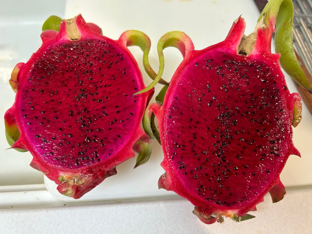 今の私の最大の贅沢は、ドラゴンフルーツの白と赤を一つずつ買って、半分に割り、紅白半玉ずつ比較しながら食する事です!!