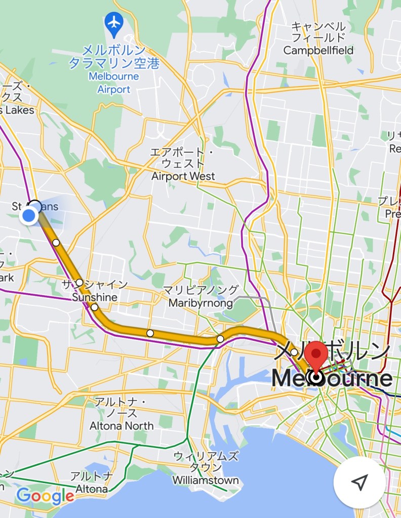 メルボルン中心地のSouthern Cross駅まで電車で40分くらいでドアトゥドアだと1時間弱です。